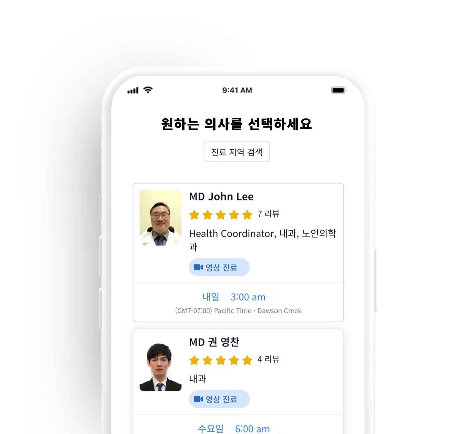 의사마다 진료 시간이 다를 수 있습니다. K-DOC Telehealth 앱에서 진료 가능한 의사와 시간을 확인해 주세요.